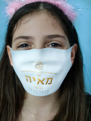 מסכה לבת מצווה בשילוב הדפסה אישית ואיכותית, מודפסת בטכניקה דיגיטלית בעלת צבעים בוהקים המוטבעת ישירות אל תוך הבד, ונעימה למגע. ניתנת לכיבוס, ולא יורדת בכביסות.